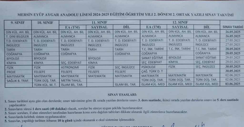 2024-2025 Eğitim-Öğretim yılı 2. Dönem 2. Yazılı Tarihleri